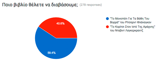 Το πρώτο βιβλίο που θα διαβάσουμε το 2016 το διαλέξατε εσείς (με ποσοστό 59,4% σε 281 ψήφους), και είναι "Το Μονοπάτι Για Τα Βάθη Του Βορρά" του Αυστραλού Ρίτσαρντ Φλάναγκαν, που κέρδισε το βραβείο Man Booker το 2014. Κυκλοφορεί στα ελληνικά από τις εκδόσεις Ψυχογιός.
